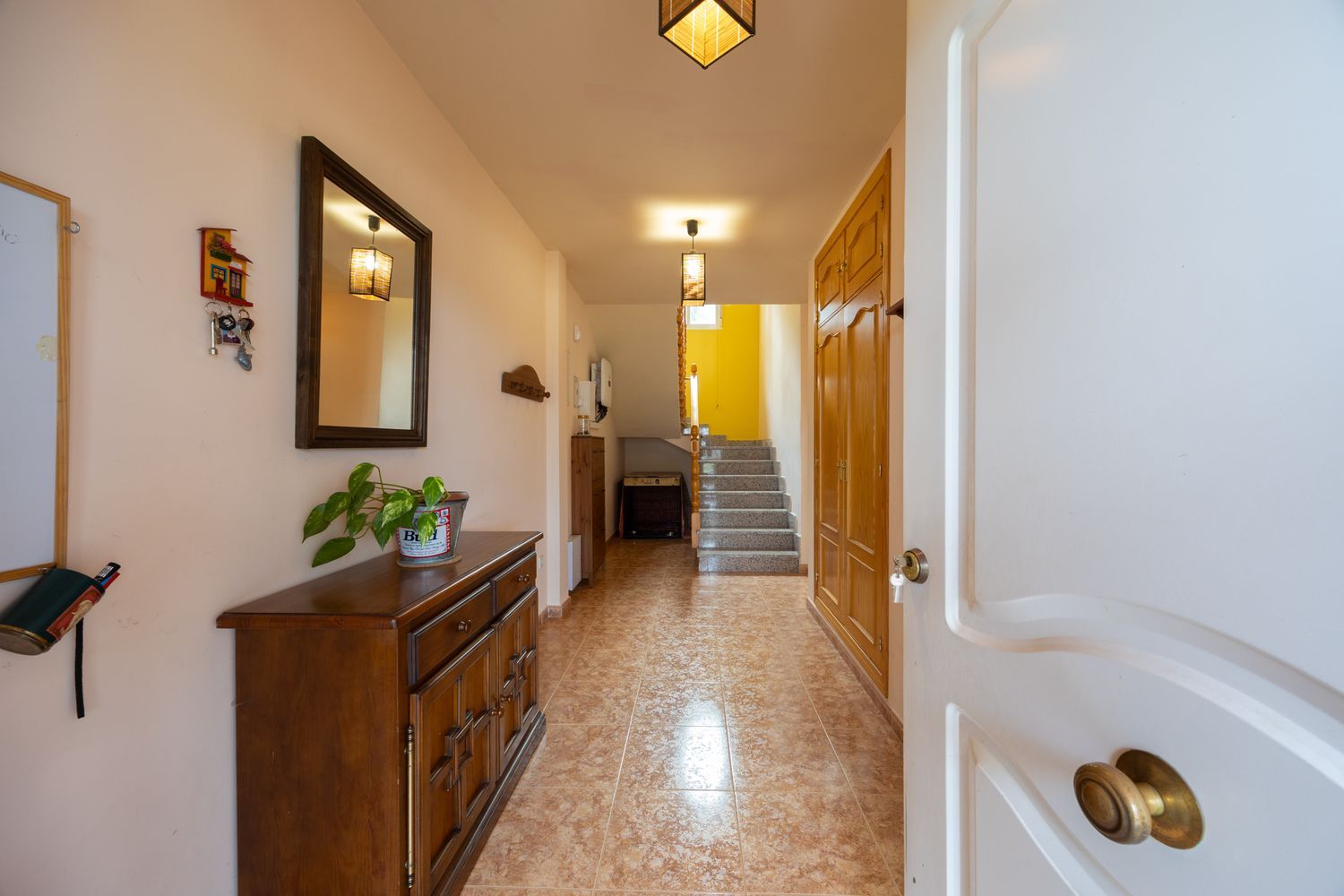 Una cómoda escalera de dos tramos conecta las dos plantas, aportando un toque arquitectónico. Las múltiples áreas de estar, junto con oficinas y dormitorios, convierten esta casa en un hogar versátil, adaptable a diversas necesidades.