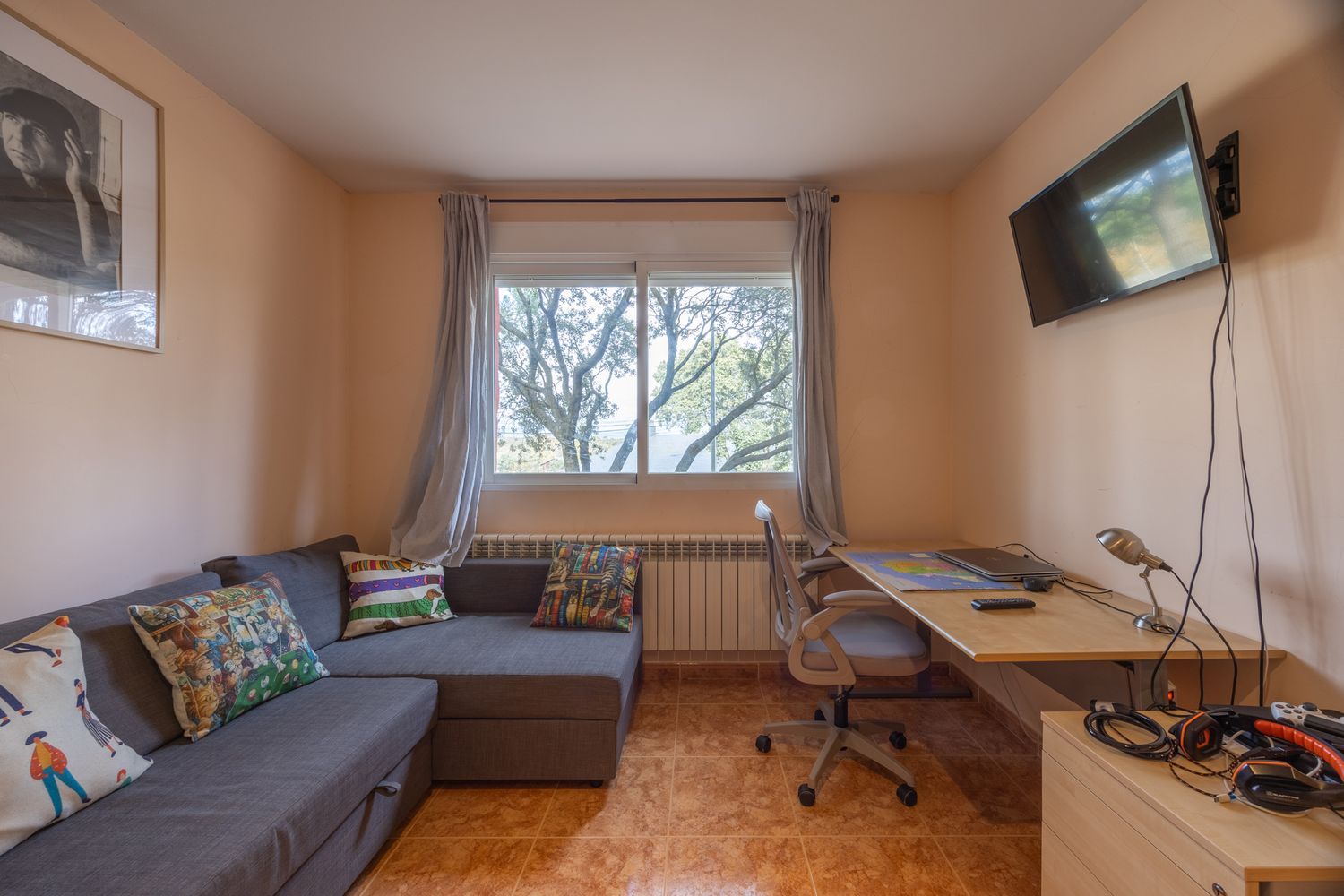 El salón comedor dispone de chimenea y de grandes ventanales con vistas al pantano de Valmayor y a la sierra de Guadarrama. Desde el podemos acceder a la cómoda terraza para disfrutar mejor de los atardeceres.