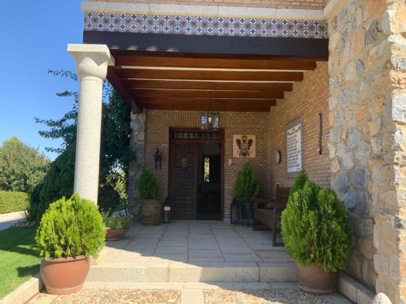 tradición y la nobleza de las grandes fincas toledanas, enclavada en un paraje privilegiado. Desde el primer instante, la entrada majestuosa —con su imponente portón de hierro forjado, flanqueado por columnas de piedra y delicados detalles ornamentales— nos transporta a una época de elegancia y distinción, cuando cada elemento tenía un sentido profundo y una belleza funcional.