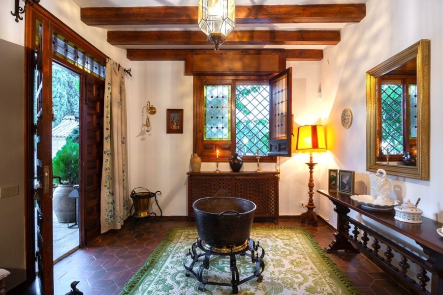 La casa, de diseño sobrio y exquisitamente tradicional, se alza con una fachada de piedra natural, maderas nobles y teja árabe, adornada con rejas decorativas que reflejan el carácter inconfundible de la arquitectura local. Construida con esmero por su propietario, esta finca alberga cinco amplios dormitorios, cinco baños, una piscina climatizada y un ala independiente para invitados. Una distribución que equilibra privacidad y amplitud, ideal para el disfrute personal o para compartir momentos con familia y amigos, en un espacio tan acogedor como funcional.