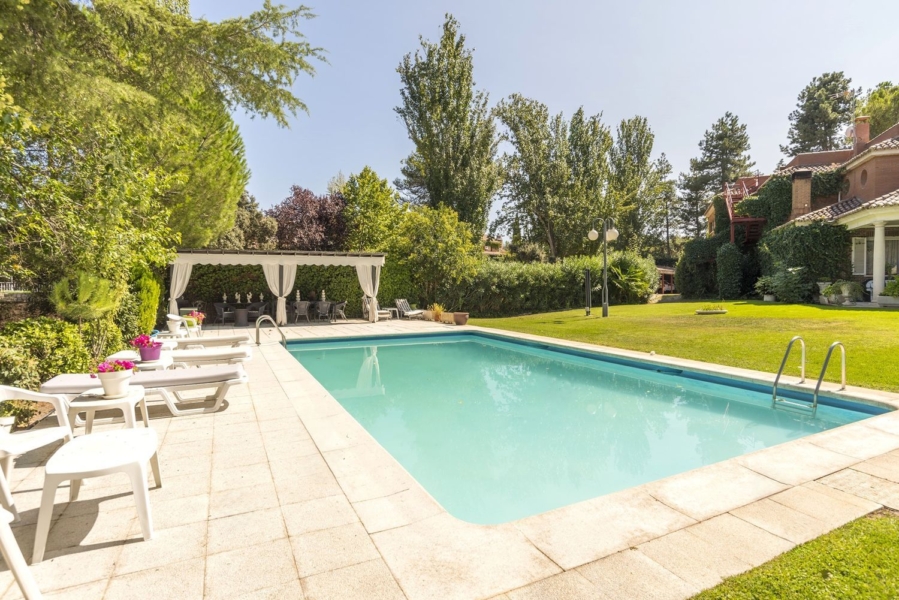 El exterior de la propiedad es una obra maestra en sí misma. La piscina exterior, rodeada de árboles y césped perfectamente cuidados, es el lugar ideal para disfrutar del sol. Además, una bonita casa de madera, que puede funcionar como espacio de almacenamiento o área de juego para los niños, añade un toque de encanto.