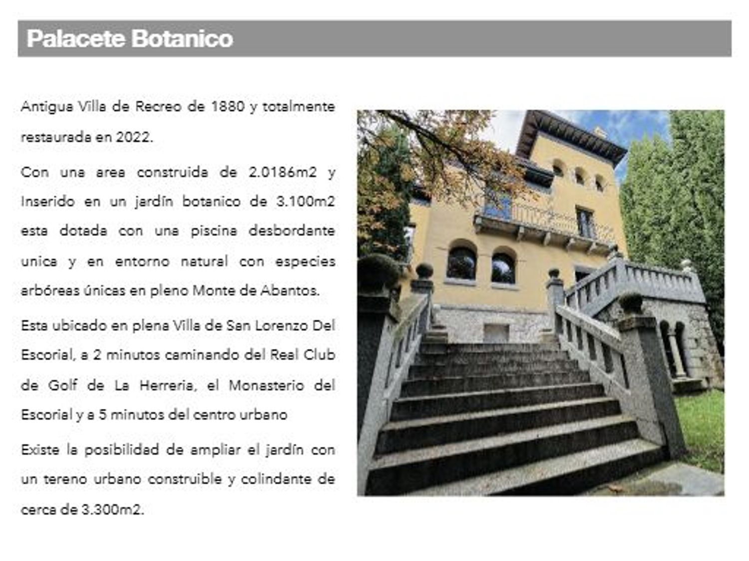 Antigua Villa de Recreo de 1880 y totalmente restaurada en 2022. Está ubicado en plena Villa de San Lorenzo Del Escorial, a 2 minutos caminando del Real Club de Golf de La Herrería, el Monasterio del Escorial y a 5 minutos del centro urbano. El palacete está insertado en un jardín botánico de 3.100m2 está dotada con una piscina desbordante única y en entorno natural con especies arbóreas únicas en pleno Monte de Abantos.