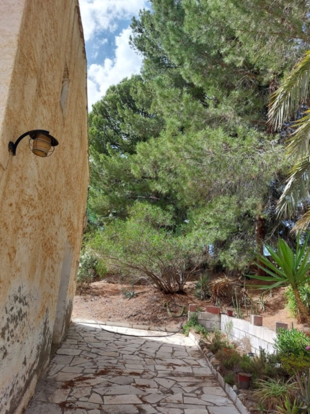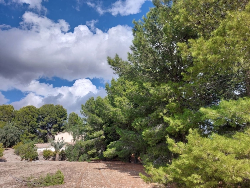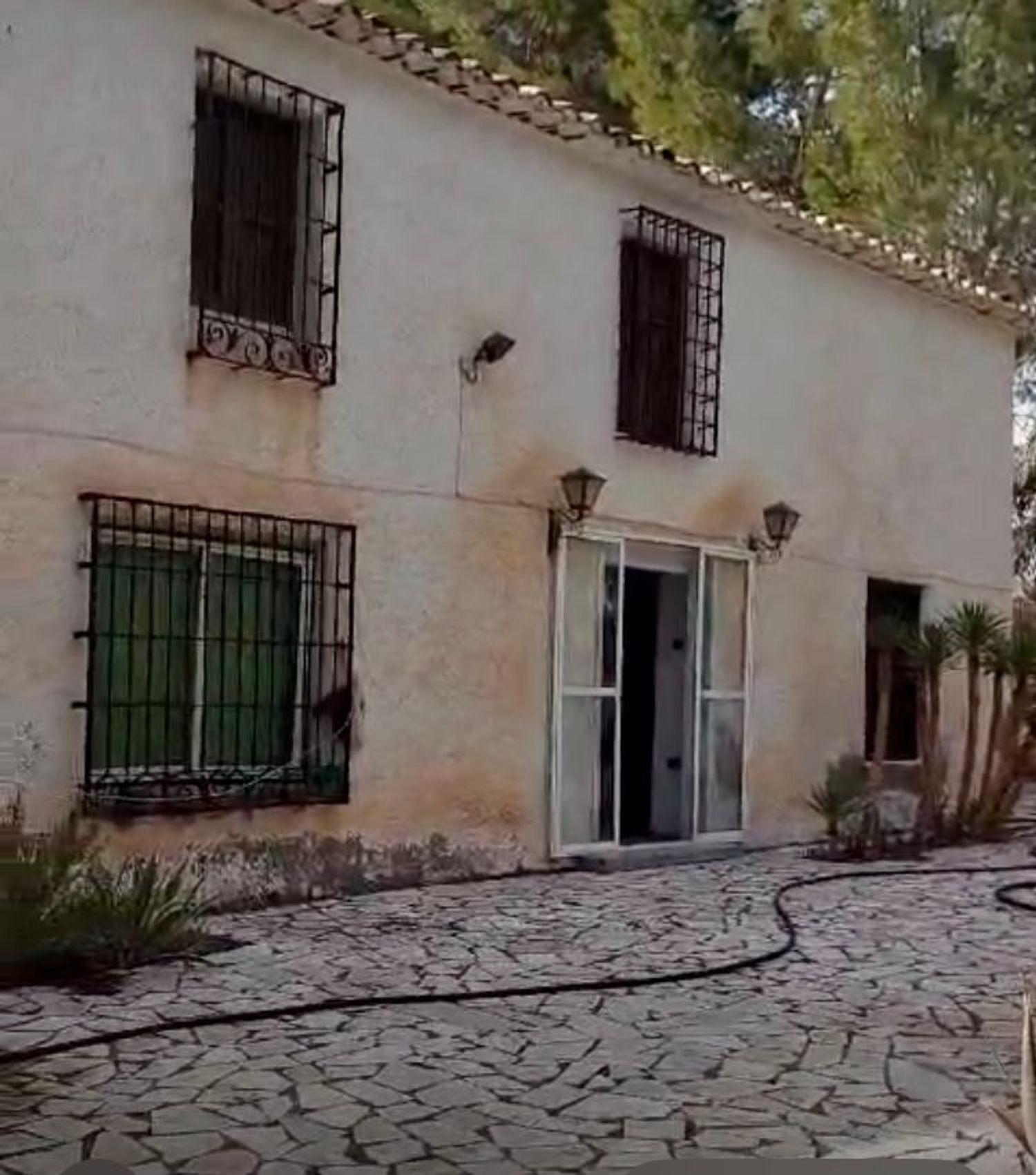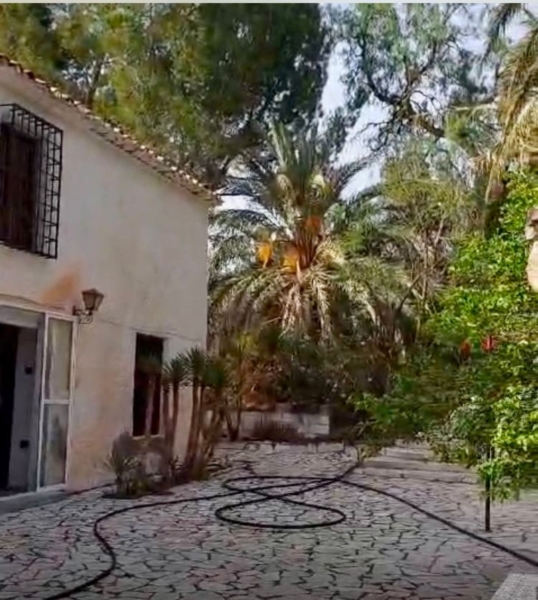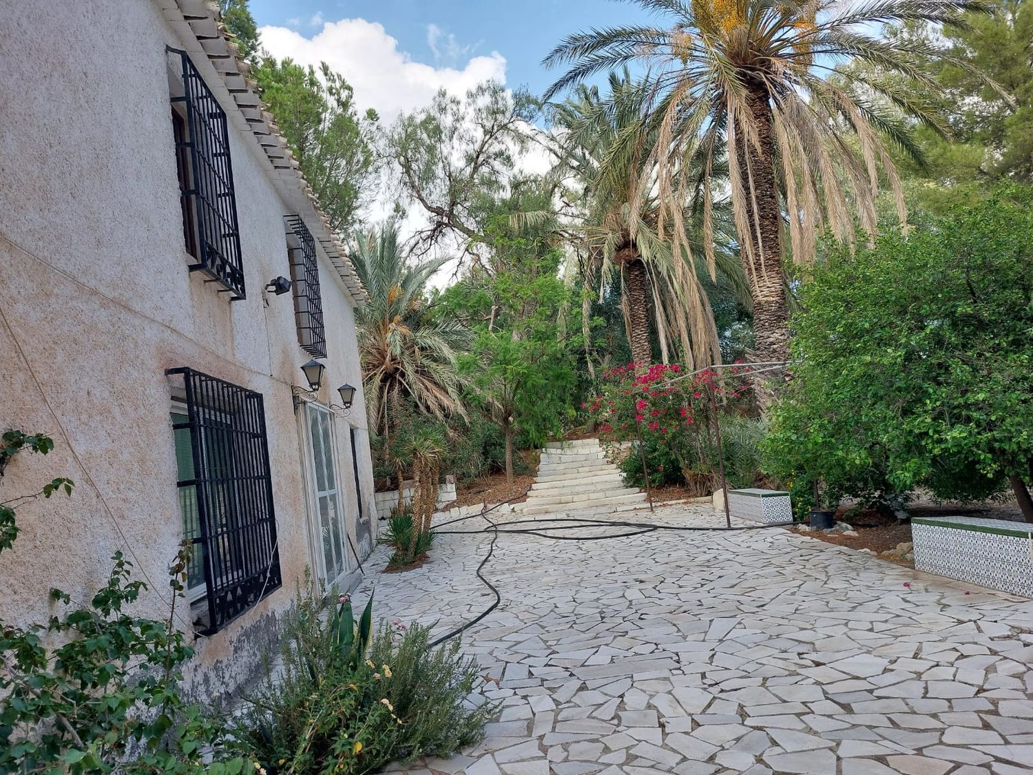 La propiedad está rodeada por un paisaje árboles frutales, olivos, palmeras y campos agrícolas.
