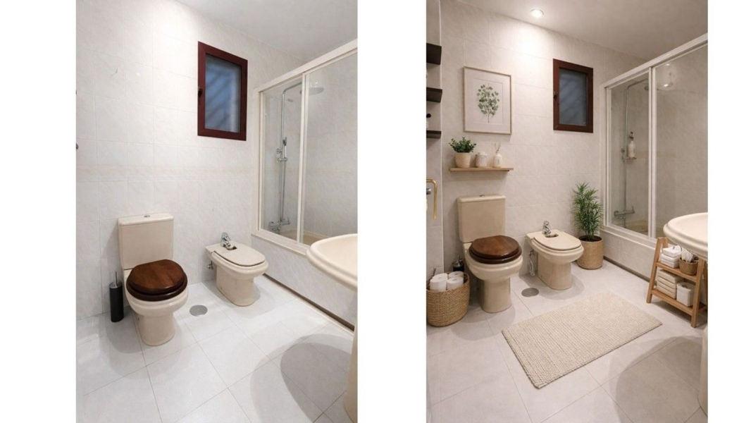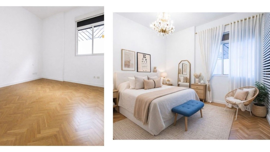 Imágenes orientativas: Las fotografías amuebladas han sido creadas con home staging virtual e inteligencia artificial. Las imágenes sin amueblar muestran el estado real actual del inmueble. Vivienda vacía, con cocina equipada y armarios empotrados reales.