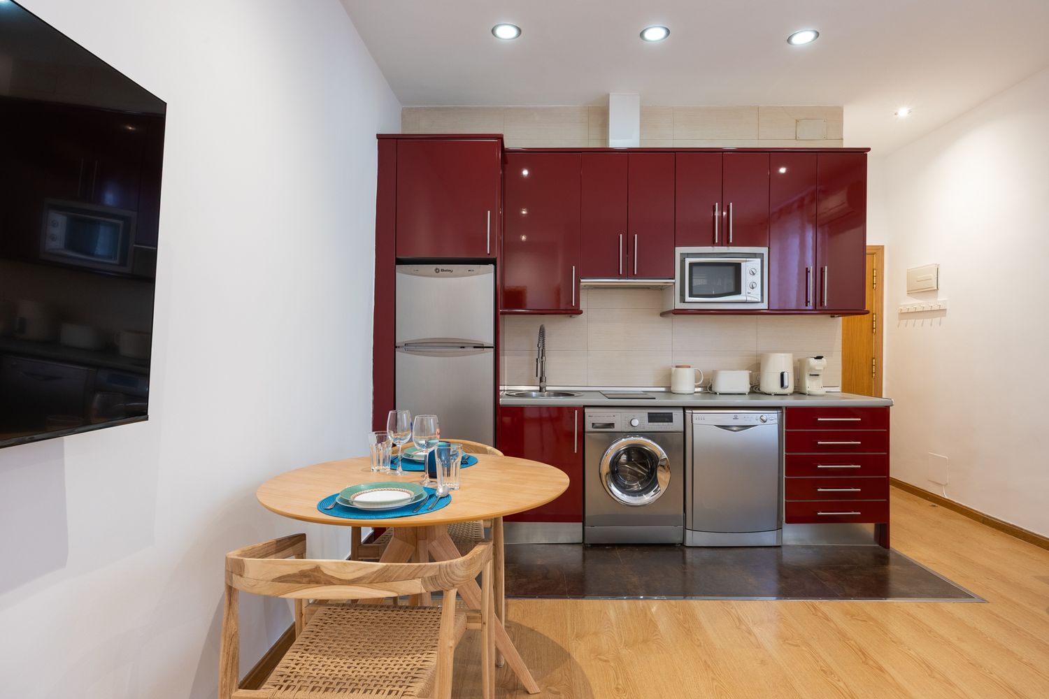 Gran salón comedor con moderna cocina integrada, totalmente amueblada y equipada con electrodomésticos cromados de primeras marcas: vitrocerámica, campana extractora, microondas con grill, frigorífico combi, lavadora y lavavajillas, así como pequeño electrodoméstico.