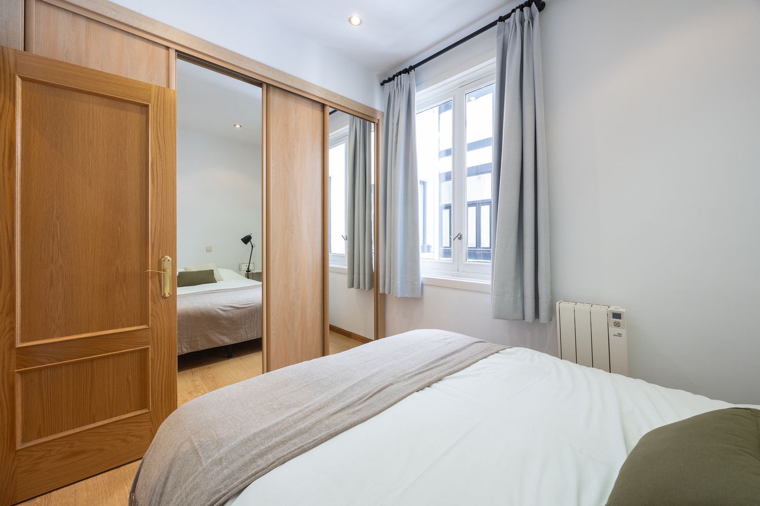 Dormitorio independiente con un amplísimo armario empotrado de pared a pared, con 4 hojas correderas con espejo, totalmente forrado y vestido por dentro.