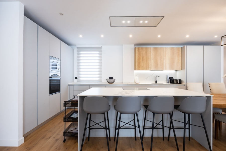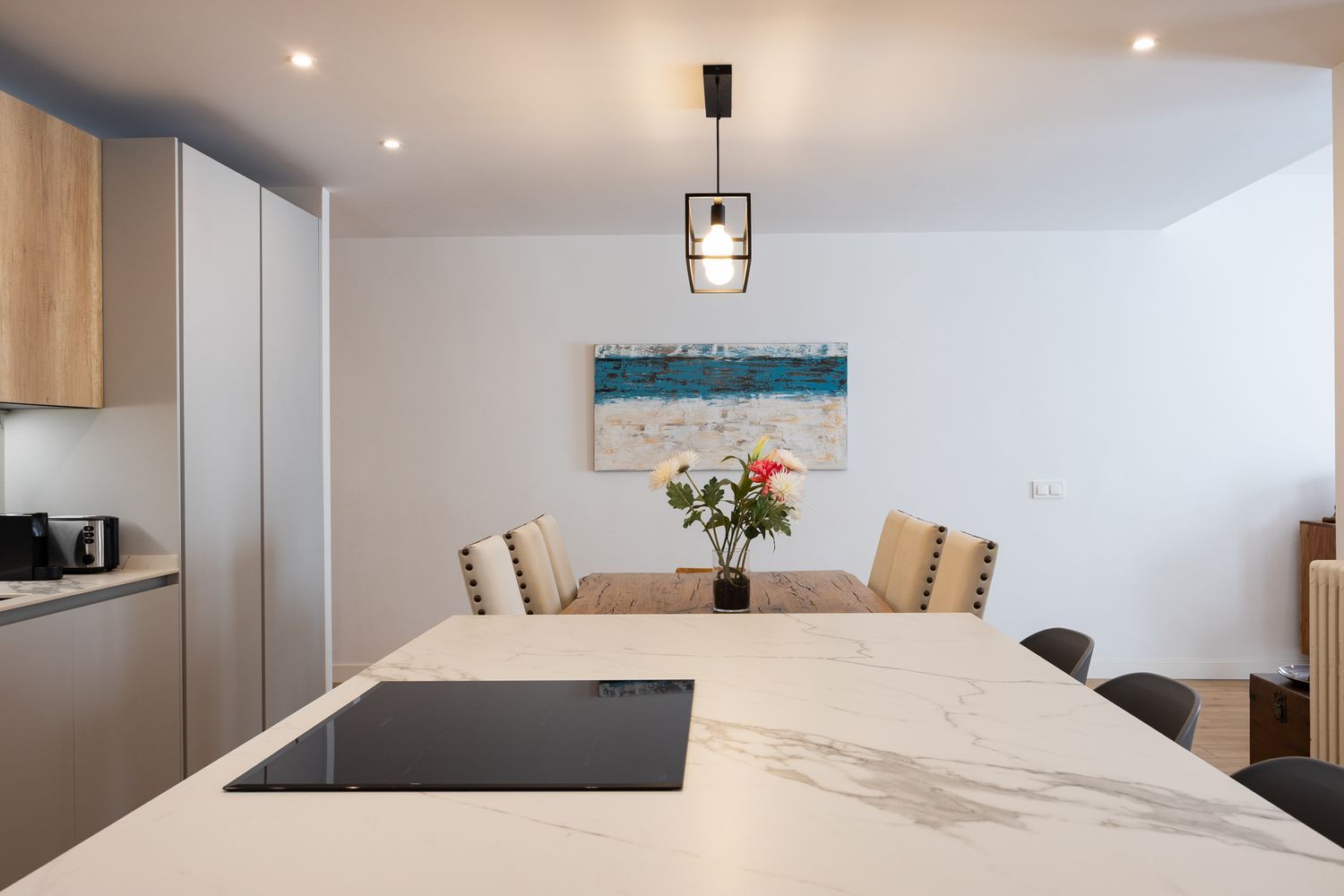 La cocina está totalmente equipada y presenta innumerables espacios de almacenamiento además de una isla de mármol y una mesa de madera que le da un toque rústico.