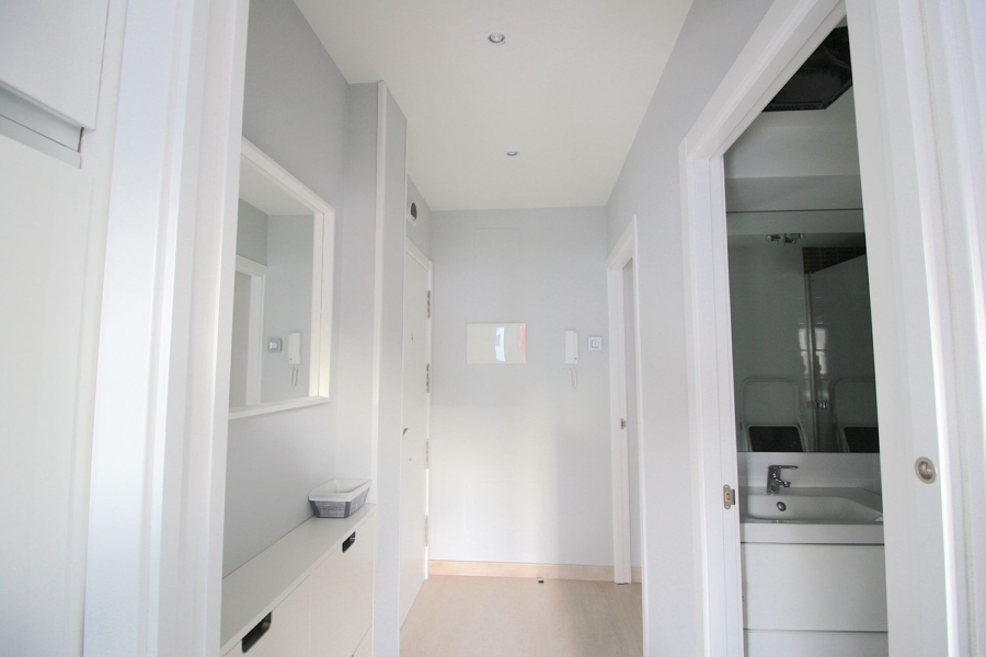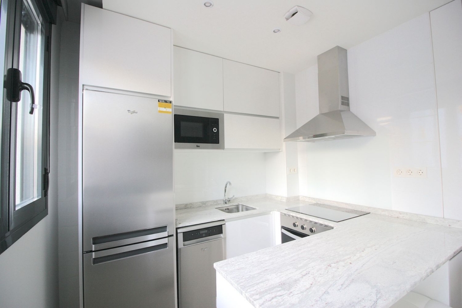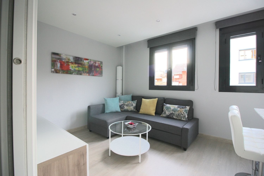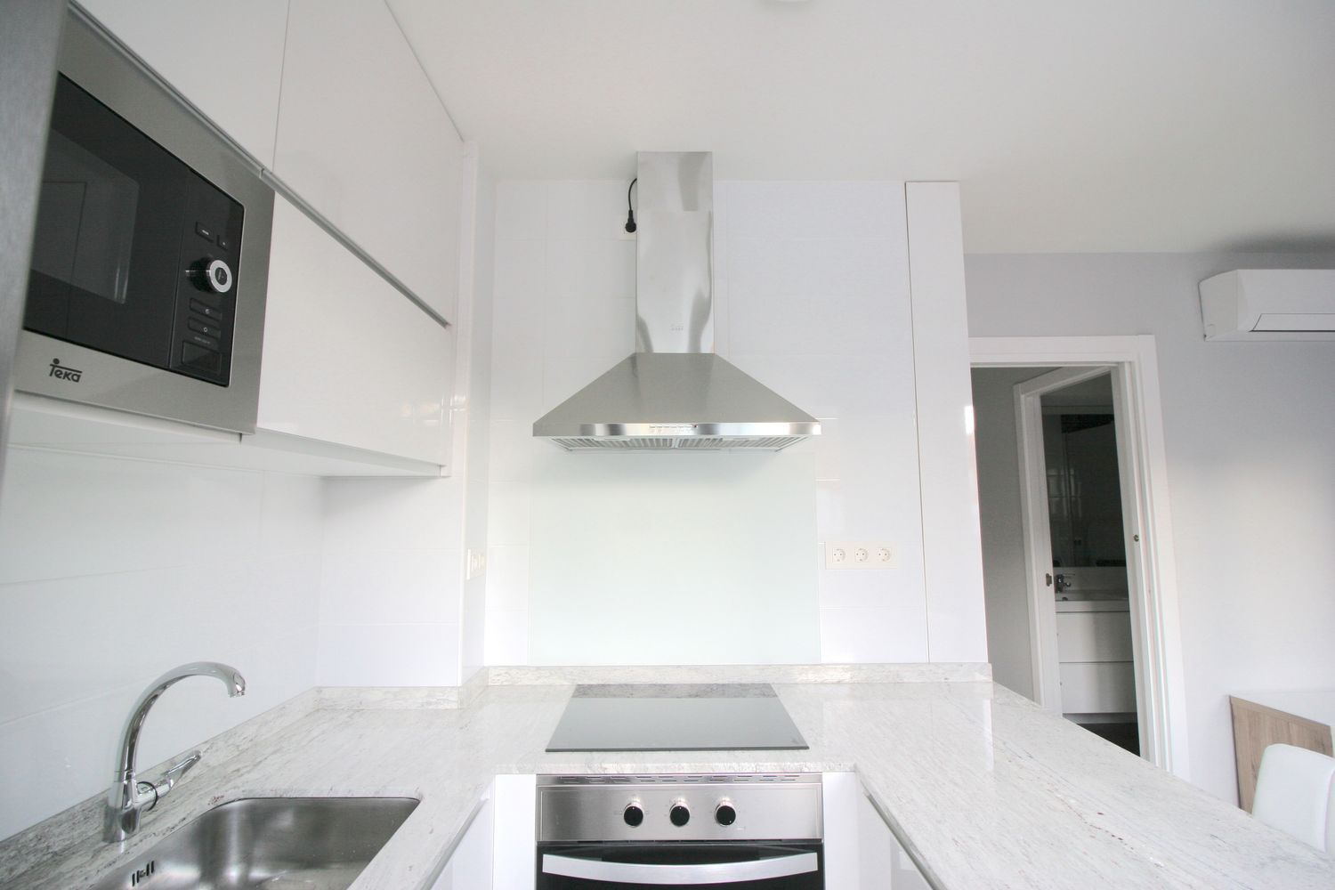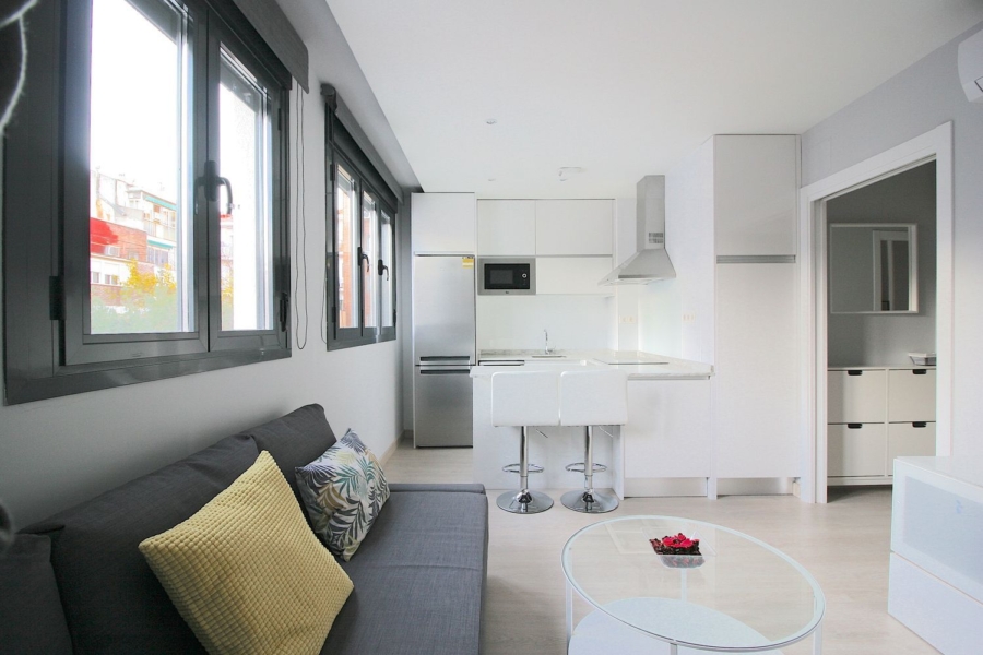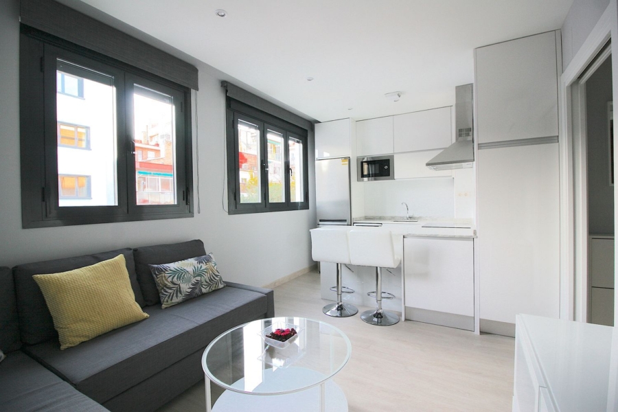 2ª planta, ventilación cruzada, salón con cocina incorporada separada por barra y todos los electrodomésticos, incluido lavaplatos, baño con plato de ducha, y dormitorio principal con armario empotrado y pequeña terraza.