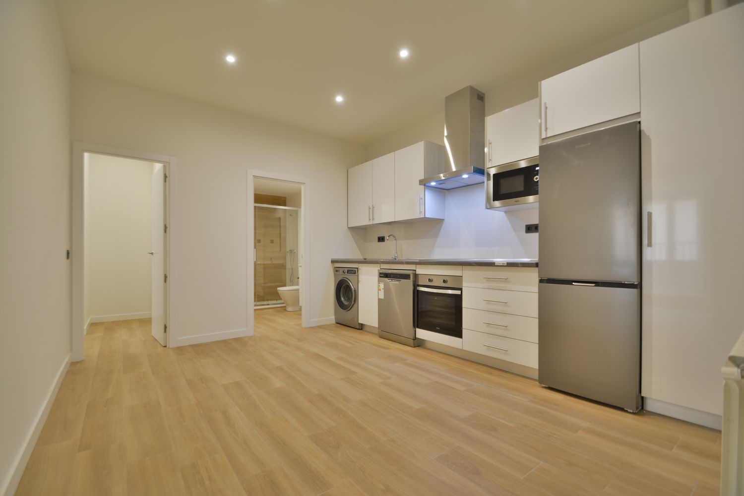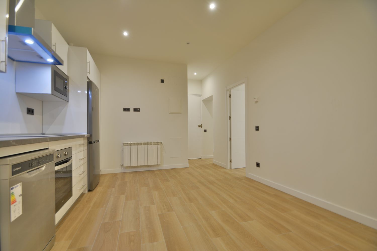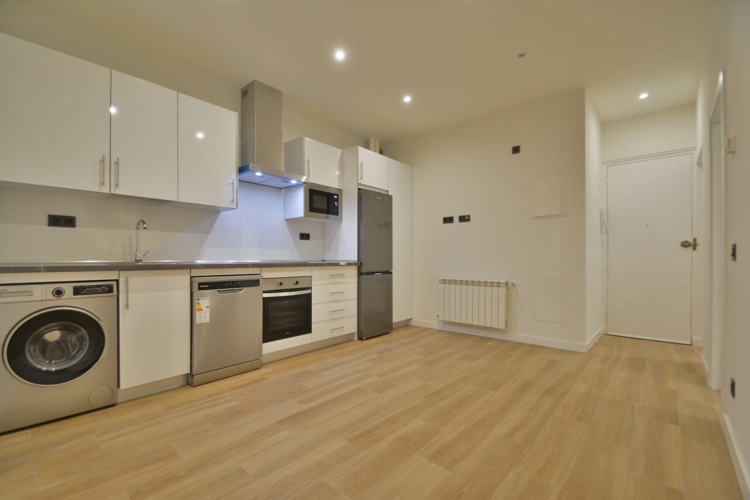 Zona de salón/estar separada del comedor con cocina americana, totalmente amueblada con muebles lisos en blanco de alto brillo y equipada con todos los electrodomésticos cromados de primeras marcas: frigorífico combi, lavadora, lavavajillas, horno eléctrico, microondas integrado, vitrocerámica y campana extractora decorativa.