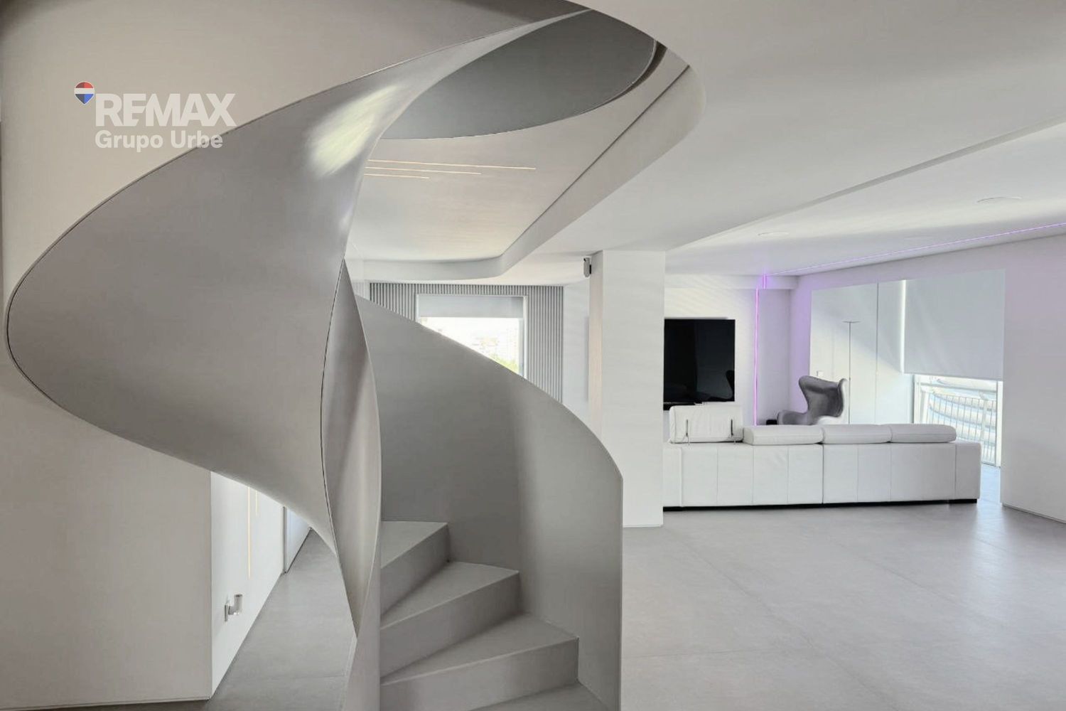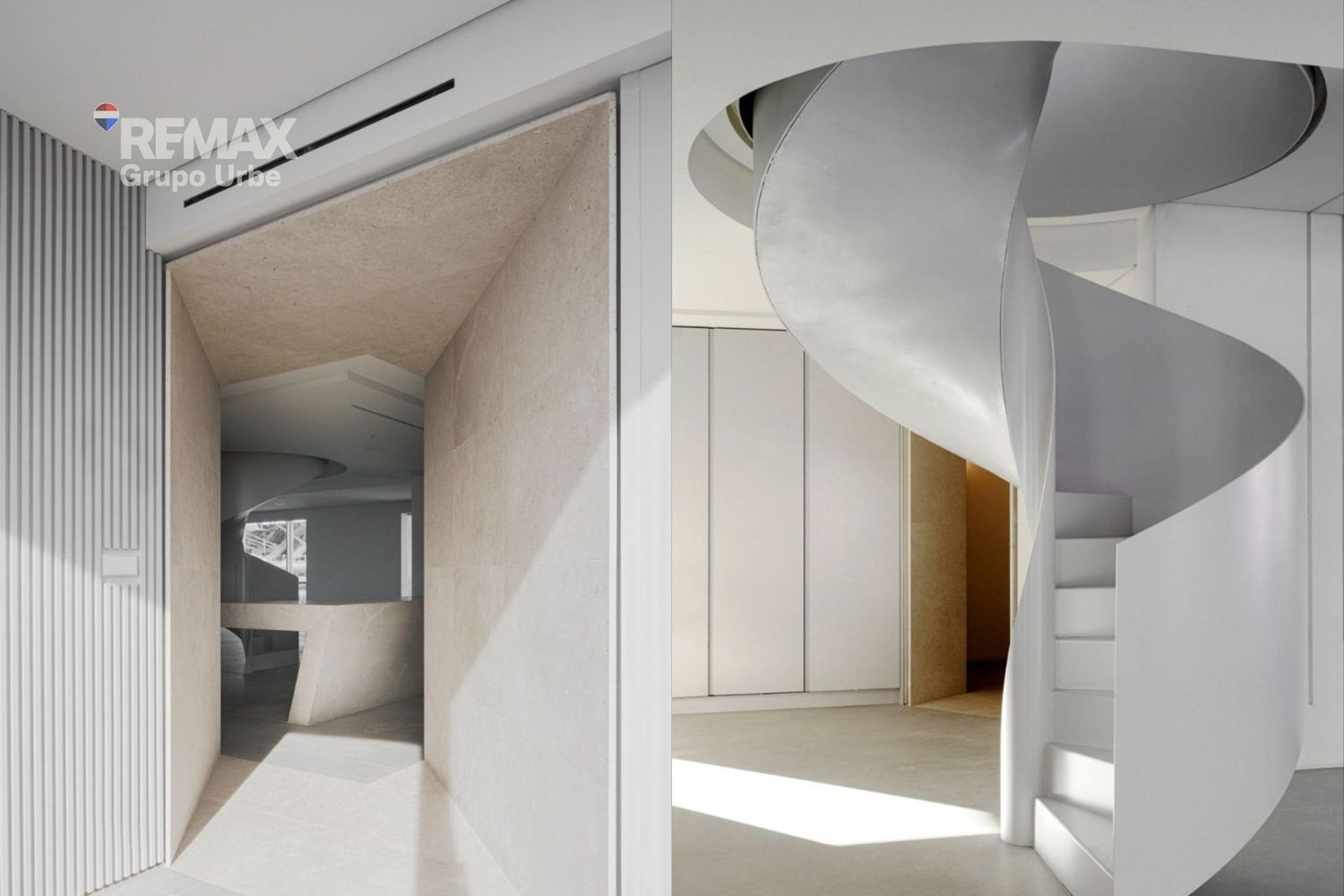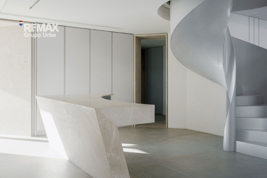 El salón principal se articula alrededor de una pieza arquitectónica singular: una escalera helicoidal de diseño define el carácter de la vivienda. Materiales de alta gama, líneas limpias, integración tecnológica-domótica de última generación, climatización eficiente, suelo radiante que asegura una difusión equilibrada del calor en toda la vivienda, junto con sistema de aire acondicionado, la refrigeración e iluminación integrada.