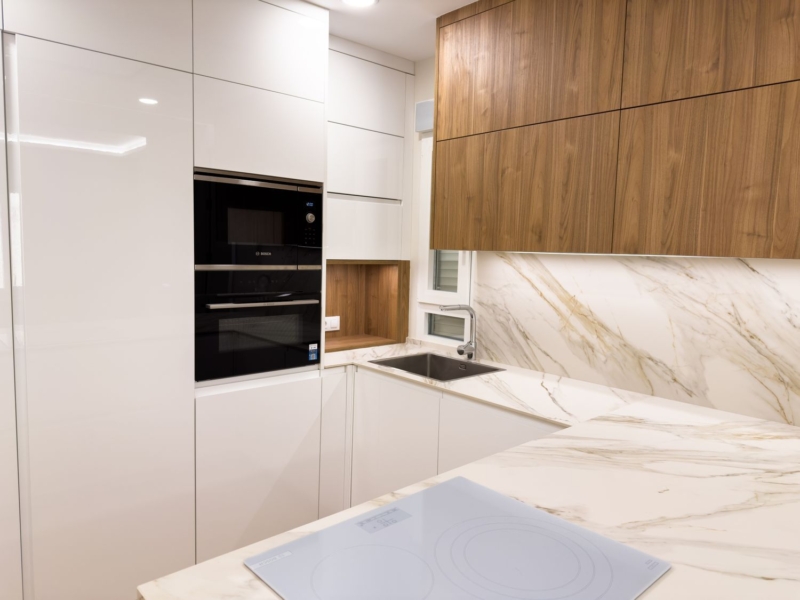 La cocina, totalmente equipada, cuenta con electrodomésticos de alta gama: Placa de inducción, frigorífico, congelador, horno, lavavajillas, microondas, campana extractora y máquina lavadora/secadora, además de numerosos armarios que maximizan el espacio de almacenaje.