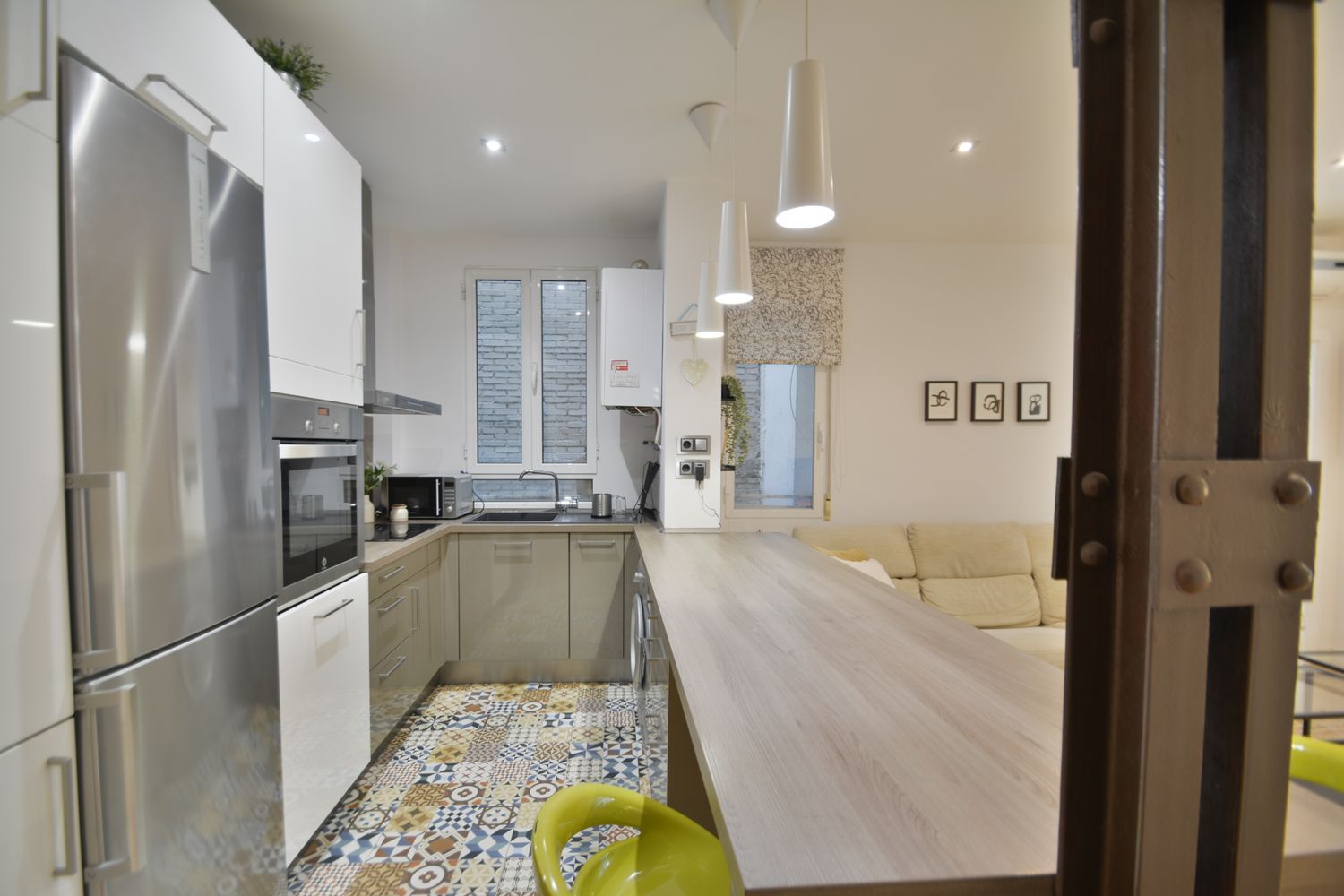 La cocina cuenta con todos los electrodomésticos: lavadora, lavavajillas, horno, microondas, frigorífico cromado, placa vitrocerámica, campana extractora cromada, y pequeño electrodoméstico. Armarios forrados y vestidos en las 2 habitaciones grandes. Se alquila con todo el mobiliario y menaje de hogar y de cama, listo para entrar a vivir sin tener que comprar nada.