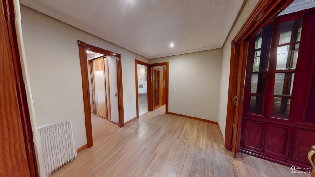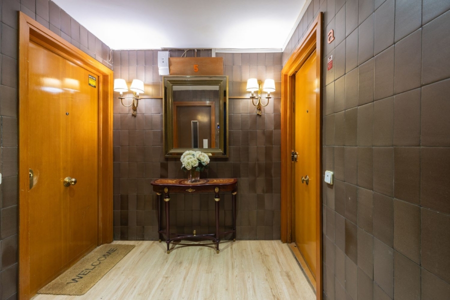 El piso tiene 2 entradas, la principal y la de servicio. Cuenta con recibidor, distribuidor, amplio salón-comedor, cocina con encimeras de mármol, 3 dormitorios con baño, uno de ellos con terraza cerrada y 3 armarios empotrados y otro con un vestidor y 3 armarios empotrados. El tercer dormitorio tiene el baño al lado, pero la puerta puede cambiarse fácilmente de sitio para convertirlo en un baño en-suite. La entrada al tercer dormitorio también puede cambiarse facilmente para ingresar desde el recibidor de la otra recámara y no desde la cocina, sin necesidad de una reforma mayor. Este cambio implicaría que se tendría un recibidor compartido para ambas recámaras, pero cada una tendría su baño completo de uso privado. El piso tiene además una área de lavandería.