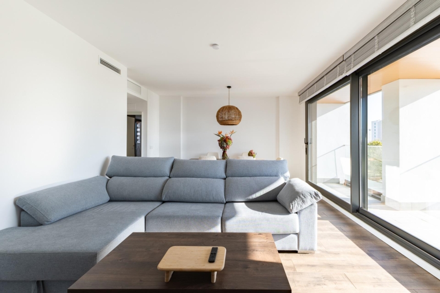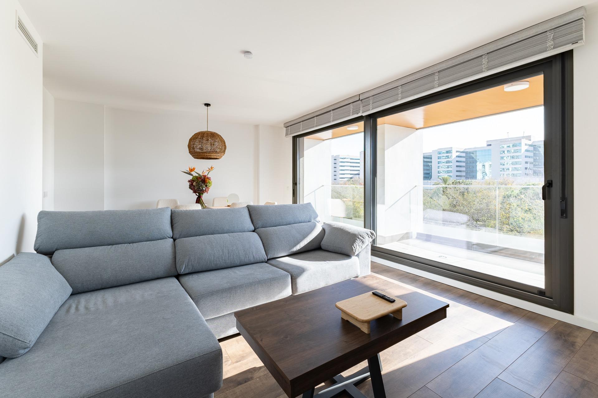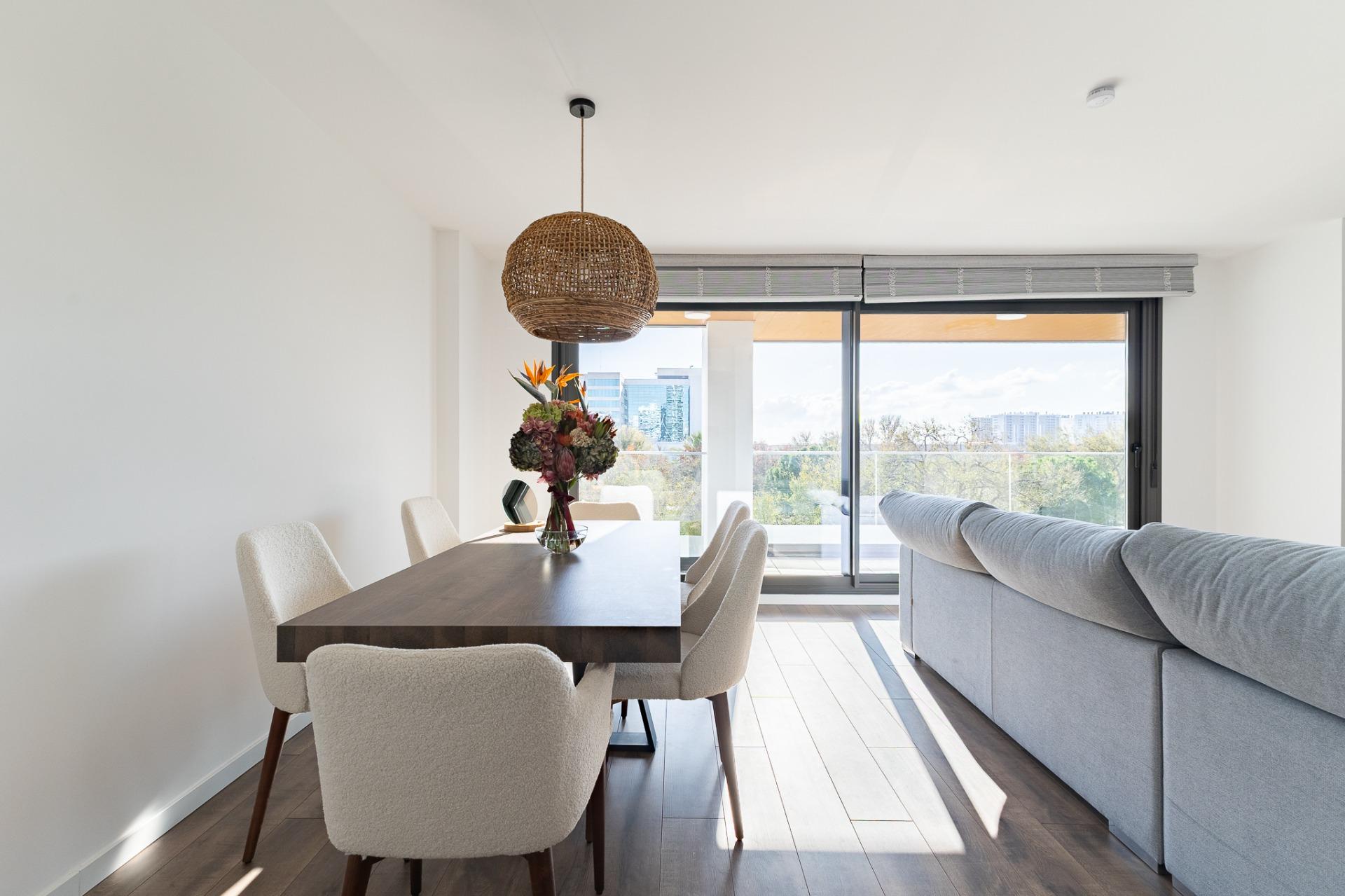Piso moderno y acogedor en un edificio de lujo en el barrio de Malilla, pertinente al distrito de Quatre Carreres, uno de los barrios más dinámicos, modernos y crecientes de Valencia capital. El edificio se encuentra a 15 minutos caminando de la estación de tren “La Fuente de San Luís”, con zonas comunes, carril bici, buena comunicación de autobús, bares y restaurantes de alta calidad y todos los servicios a tu alcance, al lado de los parques Malilla y Azagador del Morro, con entretenimientos para los niños y adultos.~El edificio tiene su propio patio vallado, con decoraciones y pequeños árboles y plantas, servicio de seguridad y conserjería, sala de reuniones, y terraza cerrada con banquillos y tumbones para coger el sol, piscina y maravillosas vistas hacia la ciudad y sus afueras.~El piso se encuentra en la tercera planta, cuenta con 103,49 m 2 construidos e incluye un pasillo grande, salón, balcón abierto con magníficas vistas hacia las zonas naturales, ciudad de Valencia y sus afueras, 2 dormitorios (uno más pequeño y otro muy grande, con un cuarto de baño individual), cocina independiente, un cuarto auxiliar con la lavadora ubicada dentro y 2 cuartos de baño en total. Ambos dormitorios tienen ventanas panorámicas con las vistas muy bonitas hacia el parque, la ciudad, la piscina y el patio interior verde y decorado del edificio de vecindad. Todas las ventanas están dotadas de lámina reflectante. El suelo laminado belga. La cama y otros~muebles montados a mano, de madera de mango y roble.~El piso cuenta con el propio sistema integrado de seguridad y vigilancia, detectores de humo, fuego y movimiento, todo manejable a distancia a través de la aplicación especializada, con un servidor individual protegido contra el hakeo.~